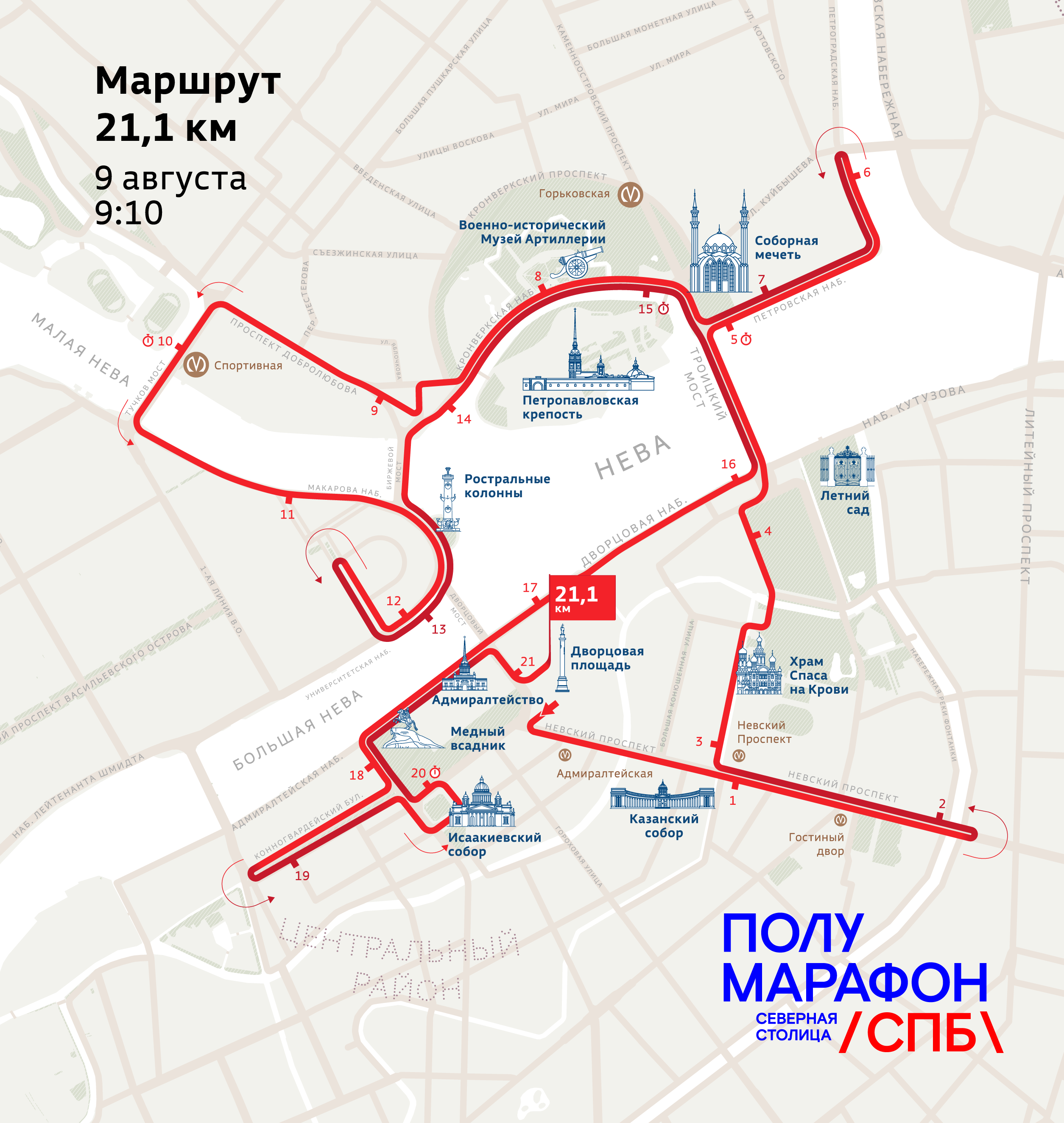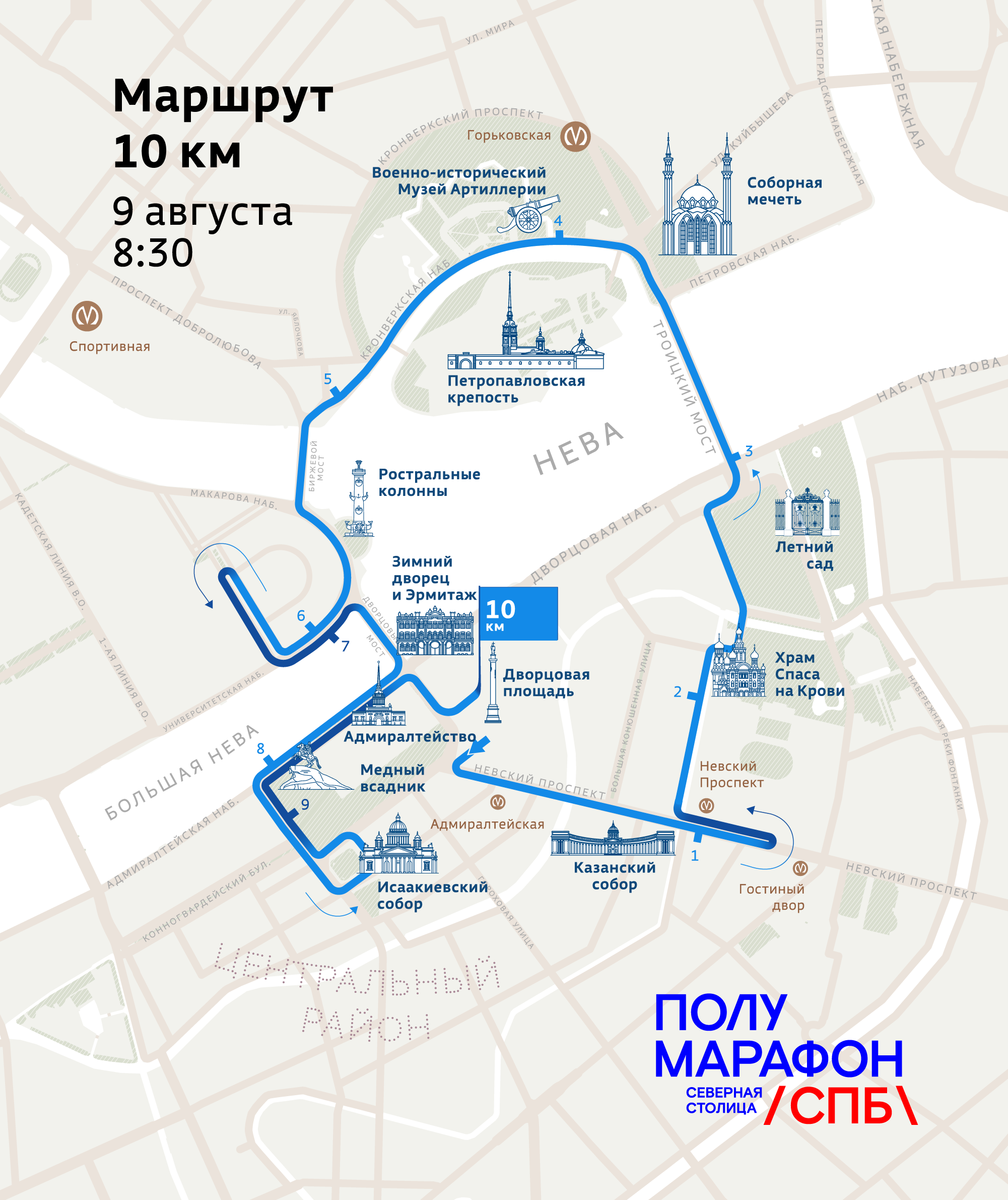 Маршрут полумарафона и забега на 10 км проходит в один круг по историческому центру Санкт-Петербурга. Участникам откроются виды на Казанский собор, Петропавловскую крепость, Ростральные колонны, Адмиралтейство и Исаакиевский собор. Старт и финиш состоятся на Дворцовой площади.